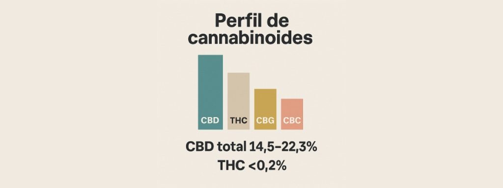 Además del número grande de CBD, conviene entender qué aportan CBG y CBC. En los informes, CBC aparece asociado a potencial antiinflamatorio (reducción de señales proinflamatorias a nivel celular), mientras CBG se vincula con posible neuroprotección (apoyo a vías que protegen neuronas frente a estrés oxidativo). No son declaraciones vacías: son tendencias bioquímicas observadas de forma consistente en la variedad y respaldadas por paneles completos. Para el usuario, esto se traduce en una base calmante que no adormece y un tono anímico más estable.
